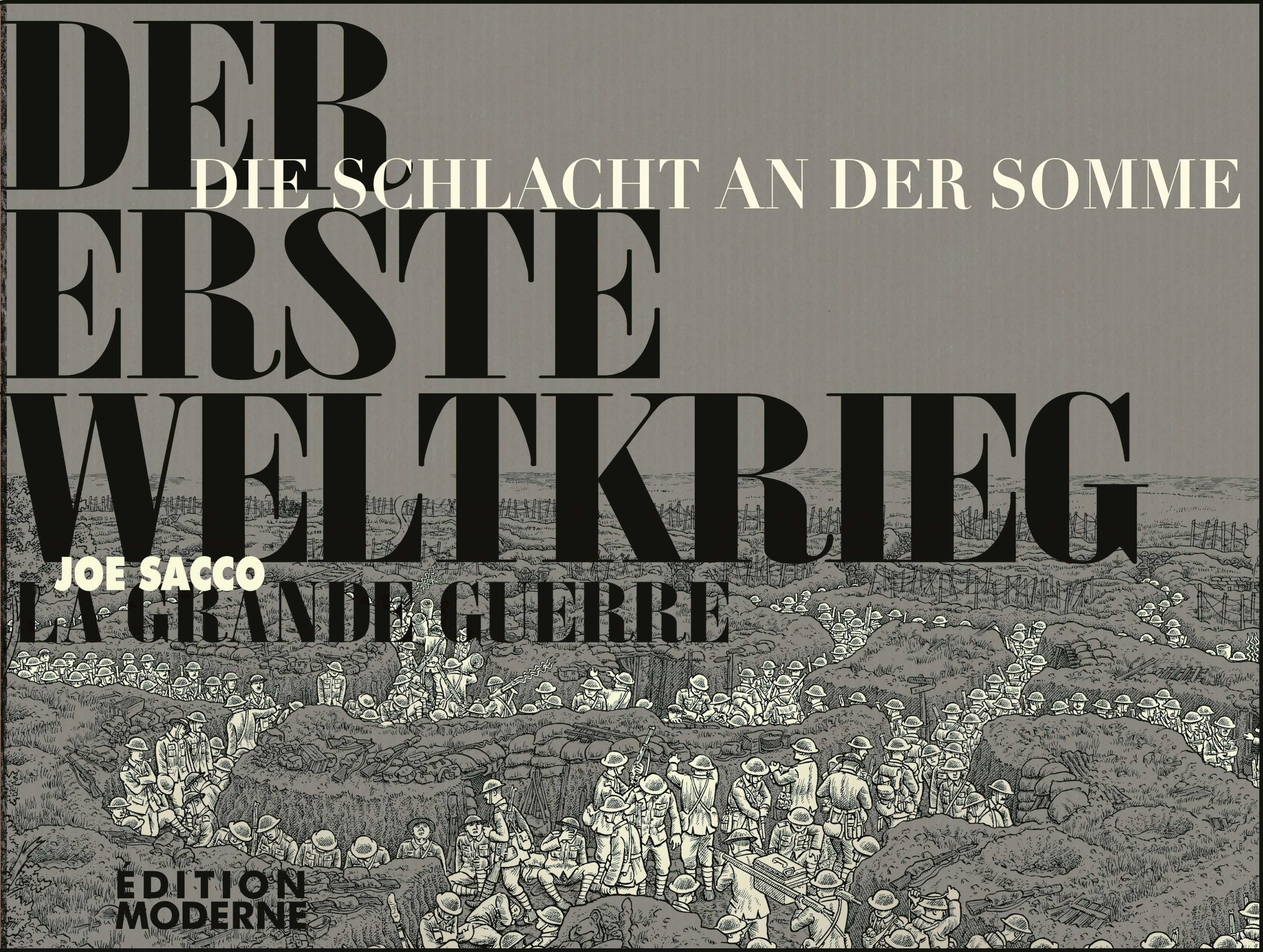 Joe Sacco: Der Erste Weltkrieg: Die Schlacht an der Somme. Zürich: Edition Moderne. 2014. Leporello mit 24 Seiten, schwarzweiss, 29 x 22 cm, im Schuber. ISBN 978-3-03731-122-6. 35,- Euro.
