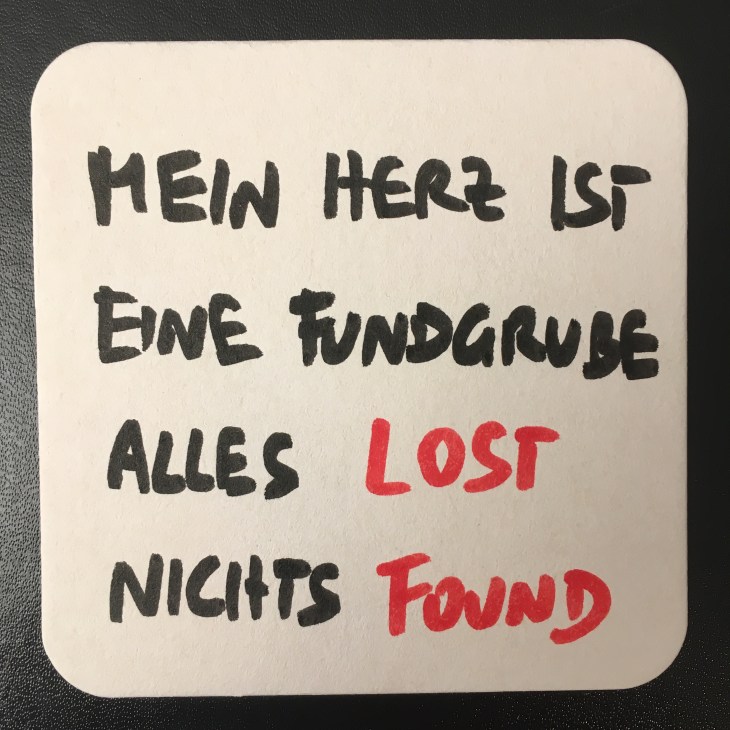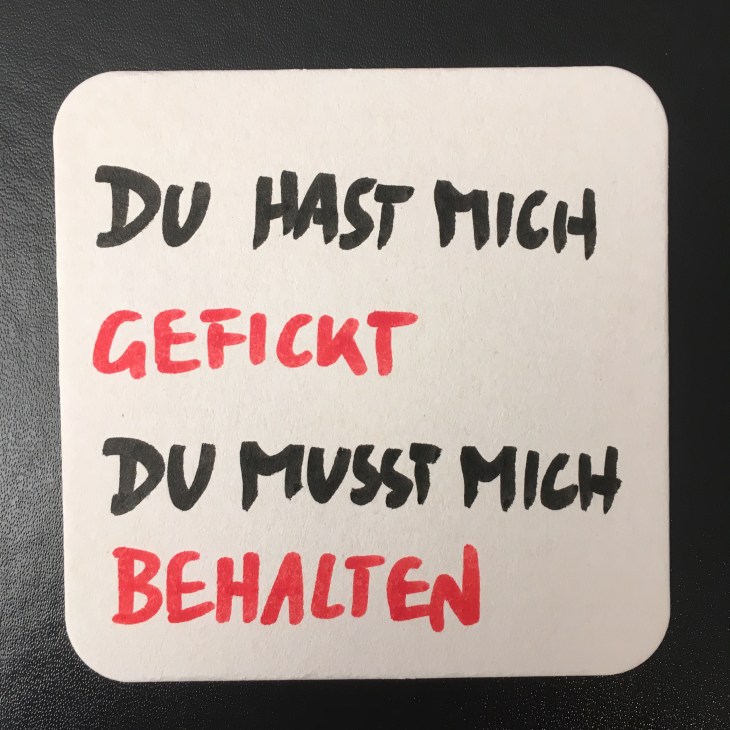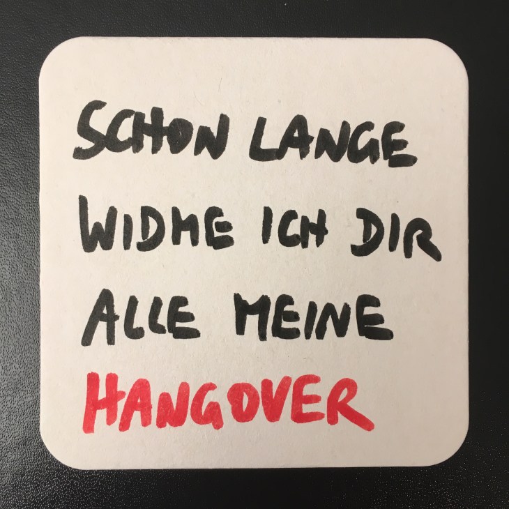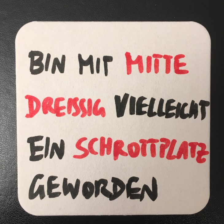 Von der Bezeichnung „Bierdeckelpoet“ würde ich mich gerne distanzieren. Da schwingt zu viel mit, das ich glaube ich nicht erfülle, auch gar nicht erfüllen will. Ich schreibe Texte auf Bierdeckel, so würde ich mich selbst beschreiben, „Gedichte“ habe ich sie damals, als ich das erste Mal mit der Textsorte experimentiert habe, in Ermangelung einer besseren Alternative genannt.
