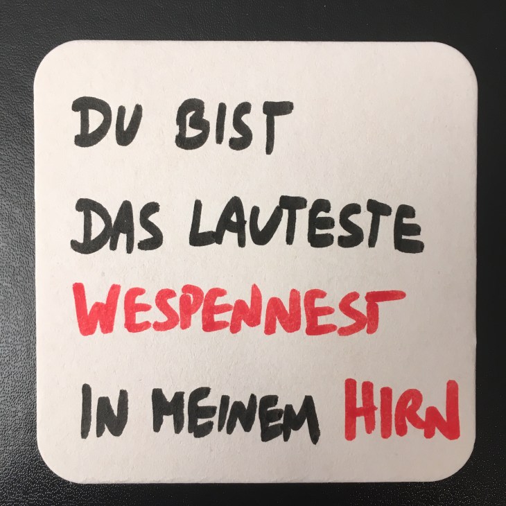 Das Medium „Bierdeckel“ bietet den Vorteil, dass man die Deckel und damit auch die Texte angreifen, dass man – wenn man will – Bier und andere Getränke draufstellen kann. Ich denke, dass dieser haptische Effekt ganz wichtig ist. Außerdem kann man sie leicht mitnehmen und weiterschenken. Vielleicht gibt es ja eine Person, der man mit einem Satz wie „Du bist das lauteste Wespennest in meinem Hirn“ etwas ausrichten will. Auch dafür eignet sich das Medium, denke ich.