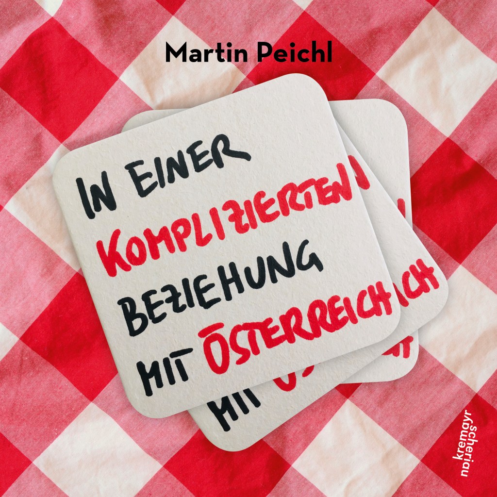 Begreifen wir den Bierdeckel also als verdichtetes und verdichtendes Medium fragmentierter Geschichten, vielleicht sogar einer neuen zeitgemäßen lyrischen Kurzform vergleichbar, dann nähern wir uns dem Schreiben von Martin Peichl an. In einer komplizierten Beziehung mit Österreich ist nach seinem Debütroman Wie man Dinge repariert (Edition Atelier 2019, Interview auf dem Hotlistblog) sein zweites Buch und erschien im Herbst 2020 im Wiener Verlag Kremayr & Scheriau. Als besonderes Gimmick bietet es nicht nur einen echten Bierdeckel an, sondern auch zahlreiche kurz skizzierte Texte auf imaginären Bierdeckeln zum Lesen: eine eigentümliche Sammlung von zarten und empfindsamen, gleichzeitig immer wieder auch betont kraftvoll und simpel gehaltenen Gedankenfetzen, Thesen, Gedichtzeilen, die sich, anders als der Titel es suggeriert, nicht primär mit Österreich befassen, sondern mit allen möglichen Beziehungsformen unserer heutigen so seltsam disparaten Welt, in der eine gelingende, einvernehmliche und gleichgewichtige Beziehung immer öfter eine kuriose Seltenheit zu sein scheint. Dementsprechend ist die grundlegende Melancholie der Texte nicht zu überhören: Hier schreibt ein Suchender, ein Fragender, im Grunde ein Romantiker.