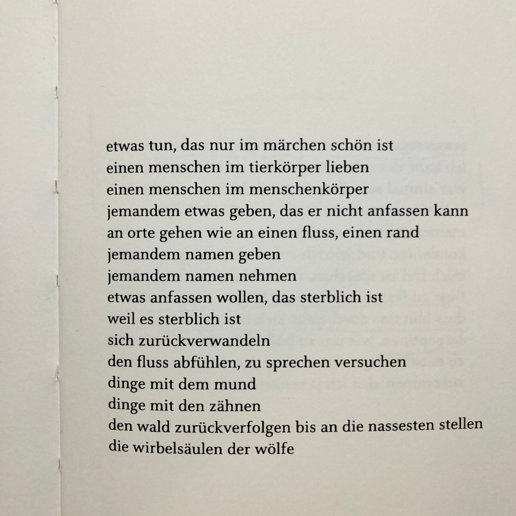 „es geht hier um starke chemische verankerungen“ – es geht um Prägungen, um die Frage, wie sehr unsere Gedanken und – damit eng verknüpft – unsere Sprache vorgeformt sind, wie sehr wir immer wieder zum selben Wasser zurückkehren, in denselben Fluss hineingreifen, um bei den Bildern der Autorin zu bleiben. Aber auch Sprachlosigkeit wird thematisiert, „so viele wörter für die abwesenheit von wörtern“, dass es eine Grenze gibt für jeden Diskurs, „was raubtiere nicht mehr zerlegen können, das wollen sie nicht mehr essen“, und die den Begriffen innewohnende Unschärfe, auch abseits des Märchenkontexts: „im märchen ist kein mund ein mund, keine abgeschlagene ferse eine abgeschlagene ferse.“