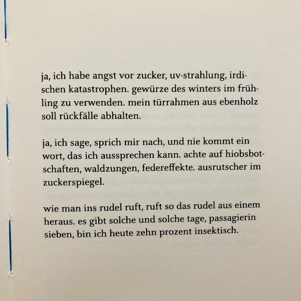 „mit dem ganzen körper lernen, dass die welt endet“ – das Thema Körperlichkeit begleitet uns beim Lesen vom ersten bis zum letzten Text, Schatten bekommen Fangzähne, im Magen leben Gespenster, und den Körper selbst durchziehen Serpentinen. Eng damit verwoben ist auch das Bedrohliche, das von den in den Texten angedeuteten zwischenmenschlichen Beziehungen ausgeht: „es ist eine traurige wahrheit, dass ich dir an die kehle gehen werde.“ Während die Hände „zum fürchten“ da sind, wird die Haut als nicht funktionierende Grenze thematisiert: „aber die haut verzeiht nichts, aber die haut merkt sich jeden kontakt.“