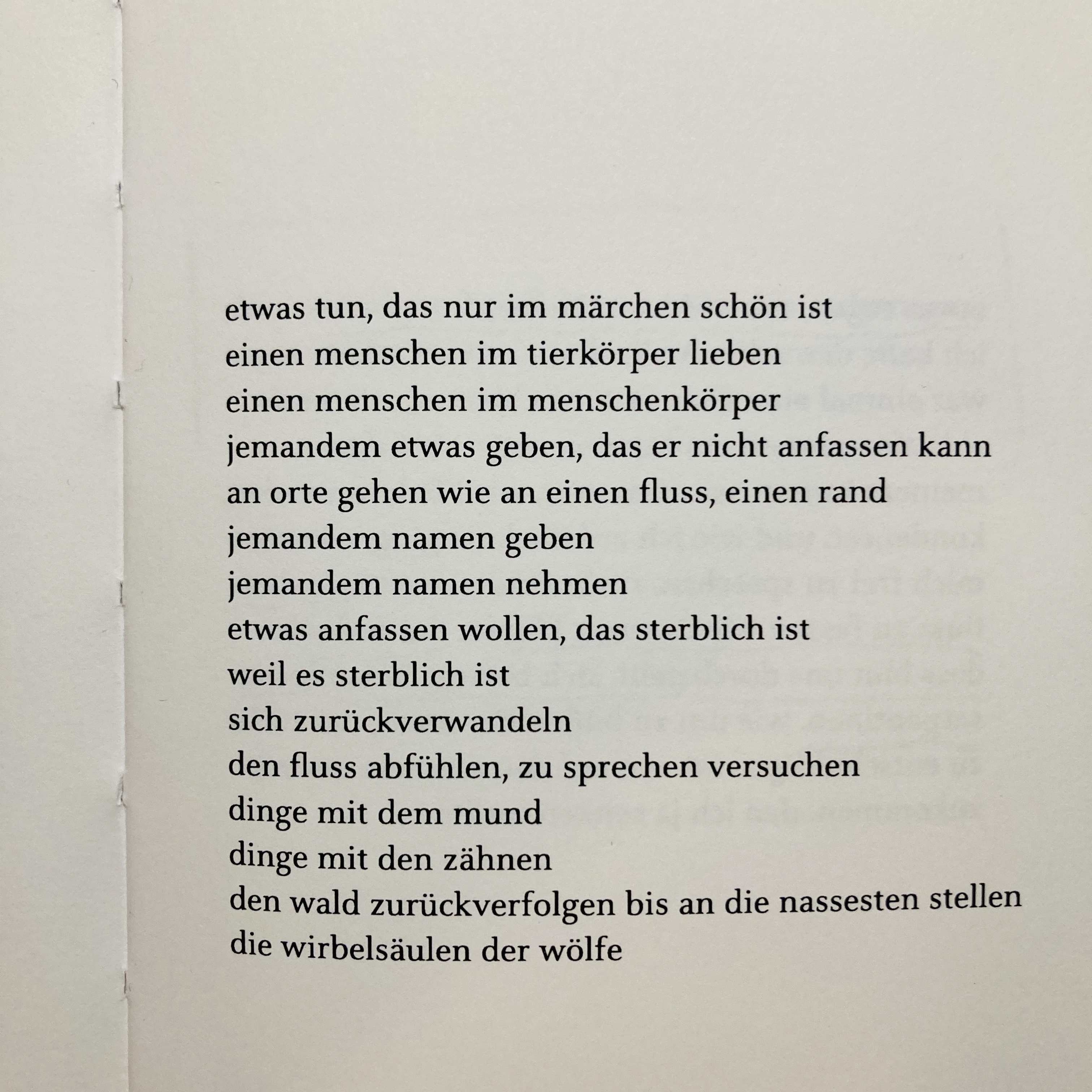 „da ist eine stumme geschichte auf der rückseite jeder geschichte“ – Stachlers geliebtes biest lässt viele parallele Lesarten zu, so zum Beispiel auch eine feministische: „im märchen sagt man frauen eine nähe zum wasser nach“, heißt es in einem der Texte, „ich kann wasser nicht mehr von säure unterscheiden“, in einem anderen. Es geht dabei auch um Vereinnahmung durch Sprache, „möchtest du über mich sprechen wie über schwärme, herden, kategorien von tier“, die mühsame Notwendigkeit, den eigenen Rhythmus an einen anderen anzupassen, das Ringen um den eigenen Text: „wie man ins rudel ruft, ruft so das rudel aus einem heraus“. Ein schöner Nebeneffekt: Man kann diese Lesarten nebeneinander stehen lassen oder sie übereinanderlegen, wie ein Palimpsest, und den „laufmaschen in der matrix“ folgen, mal in die eine, dann wieder in die andere Richtung.