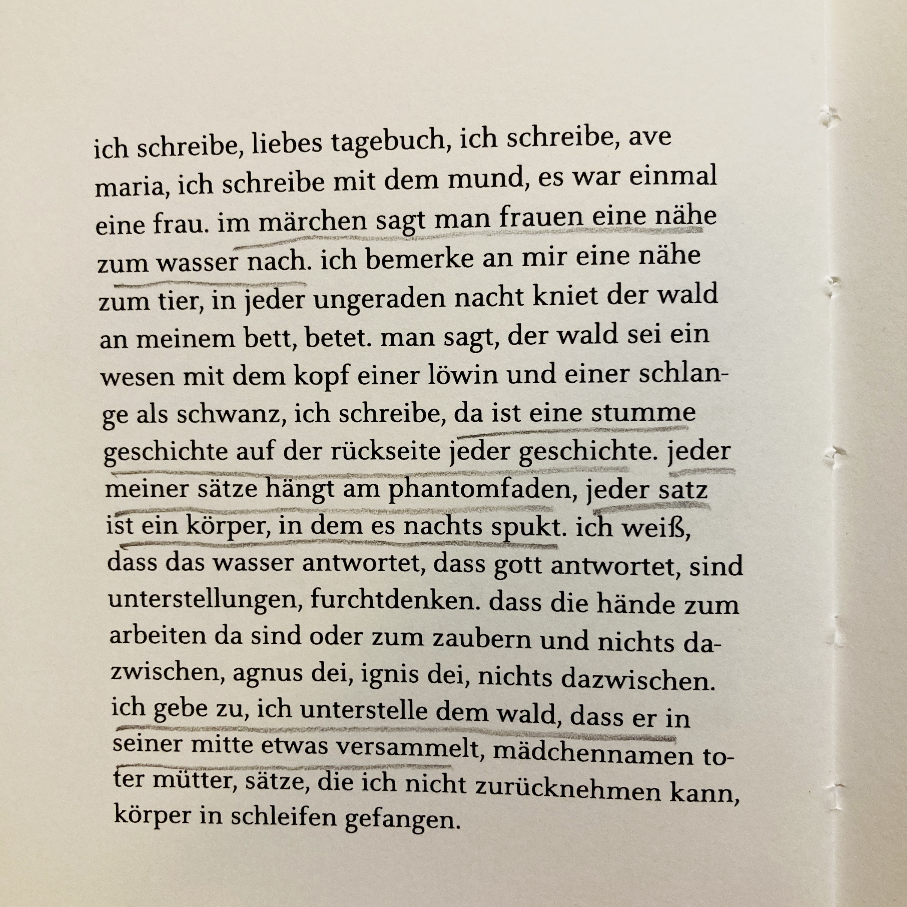 „es geht hier um starke chemische verankerungen“ – es geht um Prägungen, um die Frage, wie sehr unsere Gedanken und – damit eng verknüpft – unsere Sprache vorgeformt sind, wie sehr wir immer wieder zum selben Wasser zurückkehren, in denselben Fluss hineingreifen, um bei den Bildern der Autorin zu bleiben. Aber auch Sprachlosigkeit wird thematisiert, „so viele wörter für die abwesenheit von wörtern“, dass es eine Grenze gibt für jeden Diskurs, „was raubtiere nicht mehr zerlegen können, das wollen sie nicht mehr essen“, und die den Begriffen innewohnende Unschärfe, auch abseits des Märchenkontexts: „im märchen ist kein mund ein mund, keine abgeschlagene ferse eine abgeschlagene ferse.“