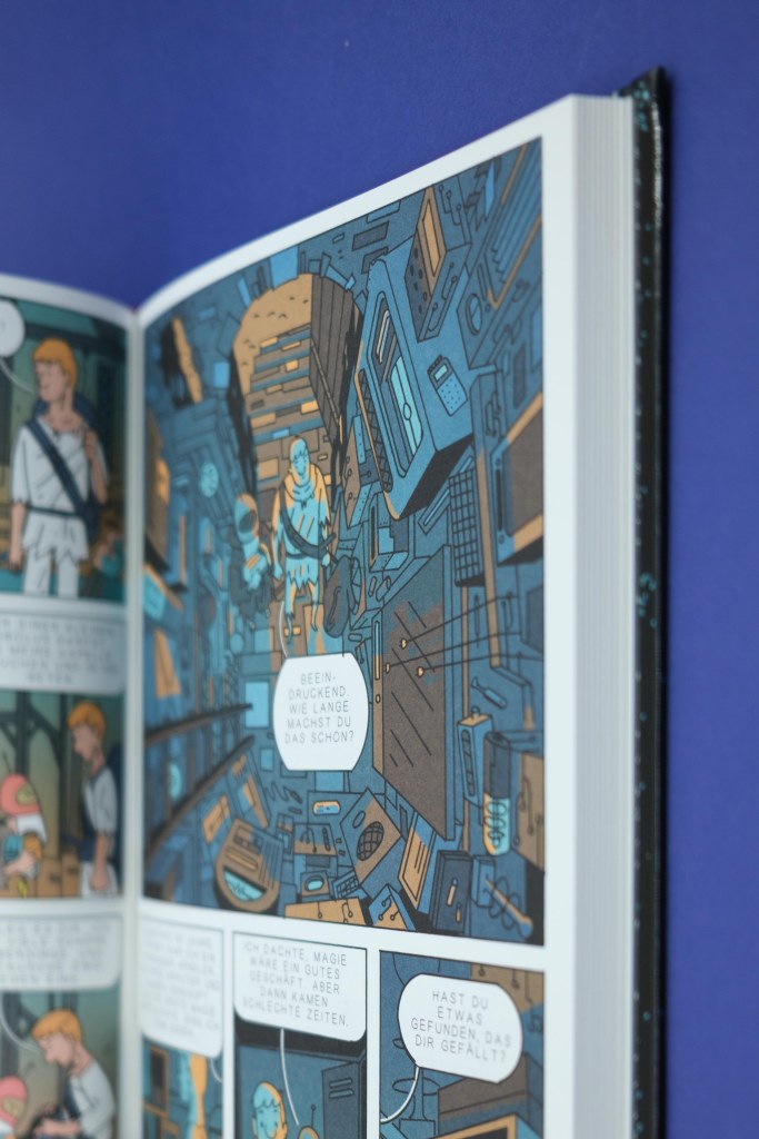 Das Setting und die anregende Bildebene greifen diese Plot- und Dialogschwächen einigermassen auf, Prinz Gigahertz bestätigt aber, was ich bei Autorencomics immer wieder beobachte: bildlich und gestalterisch opulent und herausragend, in den Dialogen und im Plot aber noch ausbaufähig.