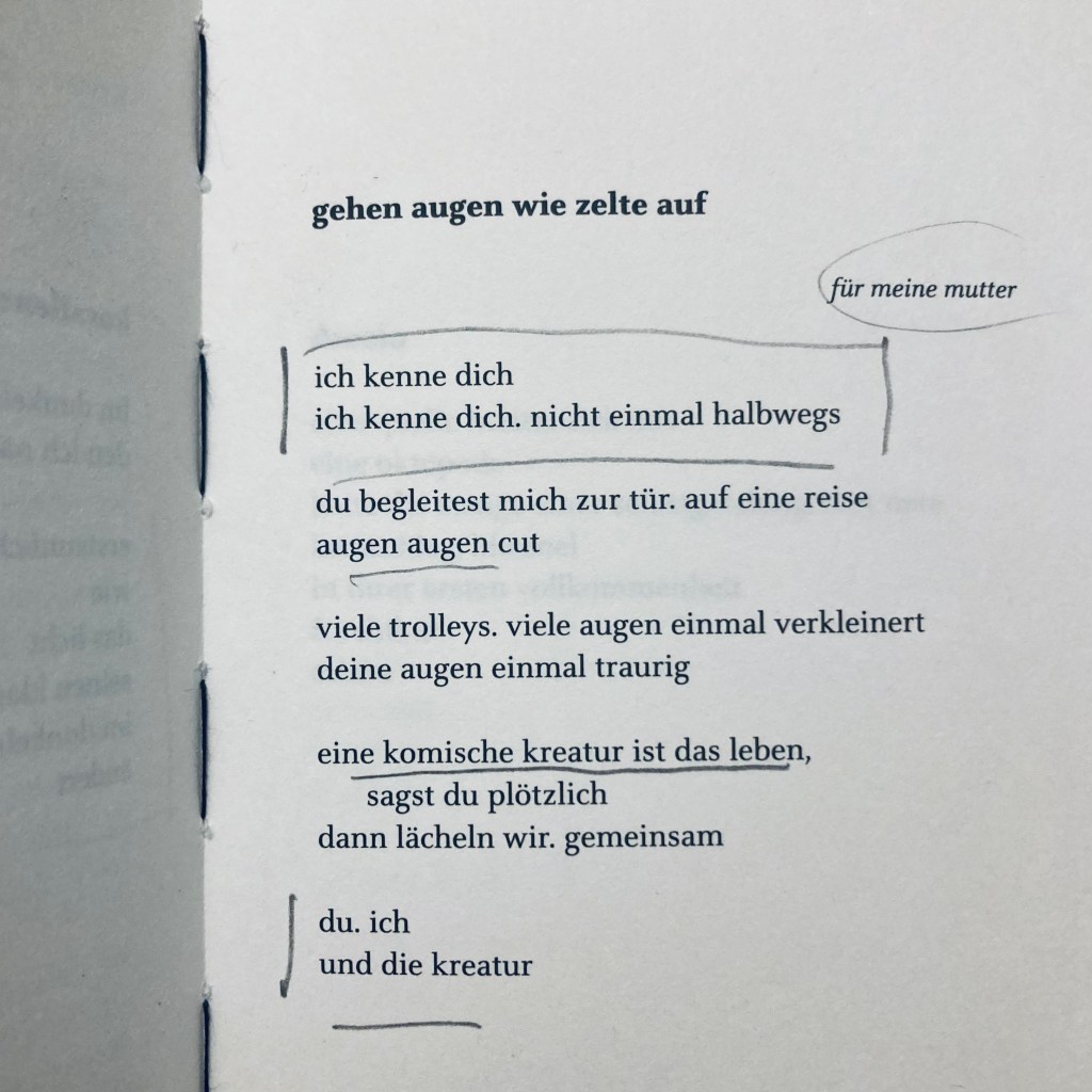 In einem gewidmeten Text („für meine Mutter“) werden die Grenzen einer gemeinsamen, einer geteilten Sprache deutlich: „ich kenne dich / ich kenne dich. nicht einmal halbwegs“. Das Leben wird von der Mutterfigur als „komische kreatur“ bezeichnet, aber es könnte genauso gut die Sprache damit gemeint sein, die ihre bedrohlichen Züge auch bei Tageslicht, auch in hellen Räumen nicht verliert: „etwas / öffnet die haut / die haut immer mehr“. Sprache als etwas von außen Übergestülptes, als Fremdkörper, der eindringen möchte, und die Haut als letzte Grenze, wo vielleicht schon andere Sinnesorgane versagt haben.