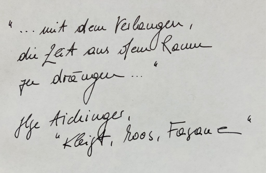Es war eine eruptive Begegnung mit dem Werk der großen österreichischen Schriftstellerin, die am 1. November 2021 einhundert Jahre alt geworden wäre, etwas in mir ist mit diesen Zeilen, mit dem Lesen des Textes aufgebrochen, ein eigener Raum, ein eigenes Erinnern. Nur kurz jedoch, nur so ein Blitzlicht. Denn es sind ausschließlich Aichingers Räume, die man betreten darf, die sich ob ihrer erzählerischen und dichterischen Kraft sogleich wieder über die eigenen legen. Auch ob ihrer Motive, die eng mit dem Leben und den persönlichen Erfahrungen der Schriftstellerin verknüpft sind, sie wieder und wieder aufgreifen. Und gut so. Sie sollen für sich stehen, sie müssen, man darf sie sich nicht aneignen dürfen, nicht die Zeit, die sich in ihnen sammelt, nicht das Erlebte, das ihnen vorausgegangen ist. Man darf nicht so vermessen sein, sich in ihnen spiegeln zu wollen. Was man darf, ist ihnen begegnen.