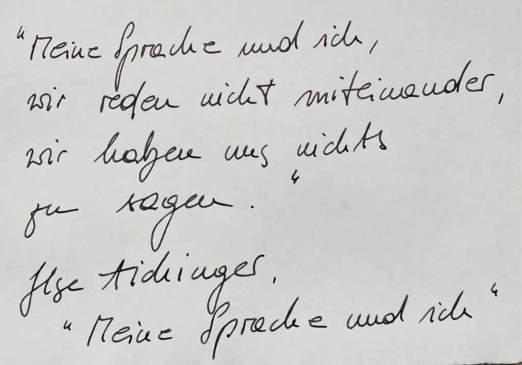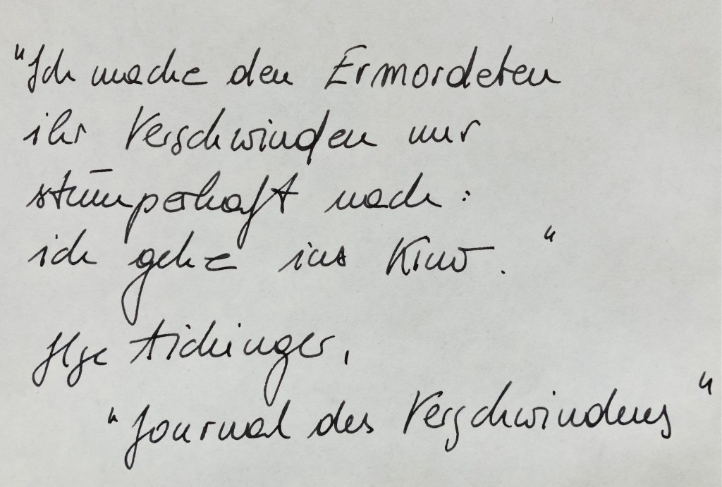 Den Räumen und Motiven, dem Erinnern und vor allem der Sprache Ilse Aichingers zu begegnen, ist der Versuch, einen Zugang zu erlebter Geschichte zu finden – den Gräueltaten im nationalsozialistischen Regime, der Deportation der Großmutter in ein Konzentrationslager, deren Zeugin Aichinger gewesen war. Die Zeugenschaft eines katastrophalen Krieges, der in den Werken stets gedacht wird, der wir Lesenden stets gedenken und von der die Sprache der Schriftstellerin spricht. Spricht? Nein, schweigt.