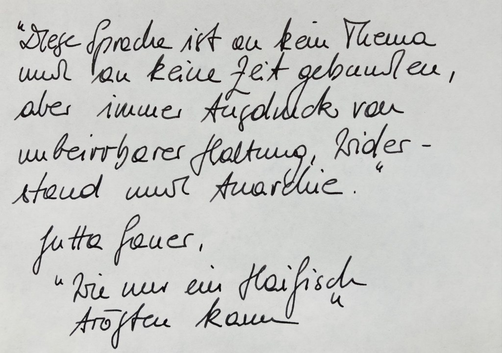 Das Zeitlose des Werkes wird der Zeit gegenübergestellt, der Zeit und ihren Orten, Wien zum Beispiel, in das Aichinger zurückkehrt, weil es Teil ihrer Biografie ist, Wien, wie Jutta Sauer feststellt, das ein imaginärer Ort ist und bleibt, der die zurückblickende Erinnerung an die Stadt jetzt zunehmend mit ihrer Gegenwart verbindet. Bewegend skizziert Sauer Aichingers Erinnern in der Zeit, der die Sprache in ihrem Wunsch zu schweigen einen Spiegel vorgehalten hat, bewegend wird in diesem Essay eine Persönlichkeit gezeichnet, die sich der Sprache in einer ihr eigenen Zeitlosigkeit verschrieben hat.