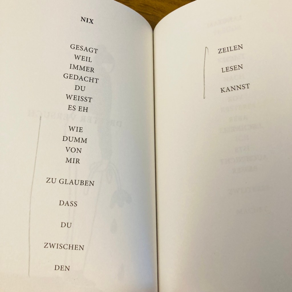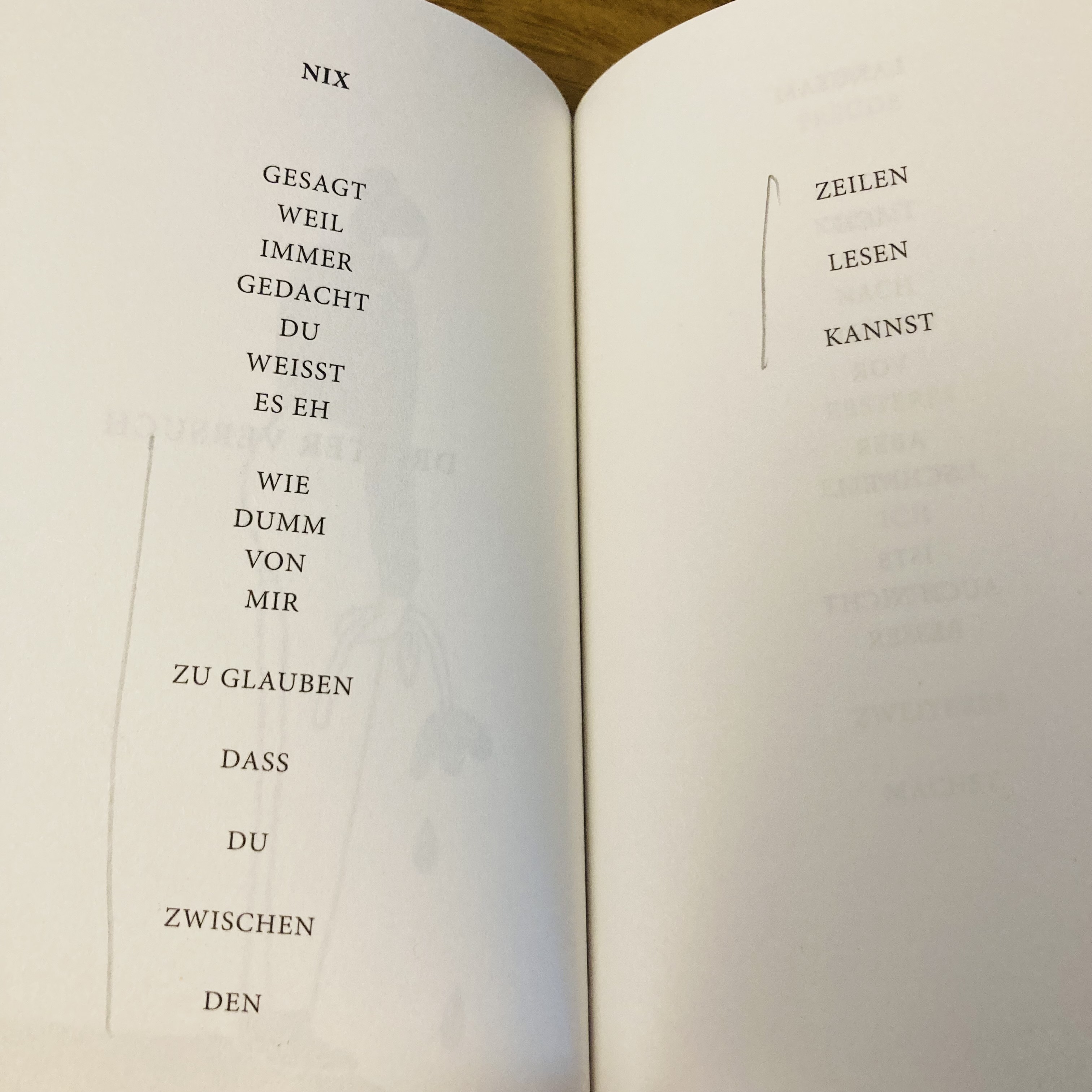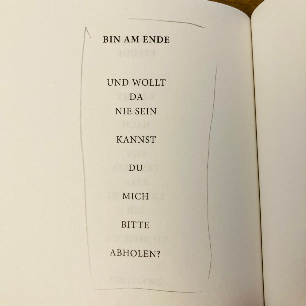 Der Lyrikband kann als ein Monolog gelesen werden, „BIS ICH LEER BIN / UND DU / NICHT MEHR DA“. Die darin versammelten Texte sind aber darüber hinaus auch ein Zeitdokument, wenn sie den Anfang der Corona-Pandemie („HATTE WAS IN LOCKDOWN TIMES / ABER JETZT HALT WIEDER BUSY“) oder den Terroranschlag in Wien vom 2. November 2020 thematisieren, verknüpft mit der Frage: Was passiert, wenn eine Sprachlosigkeit von einer zweiten umwickelt wird?