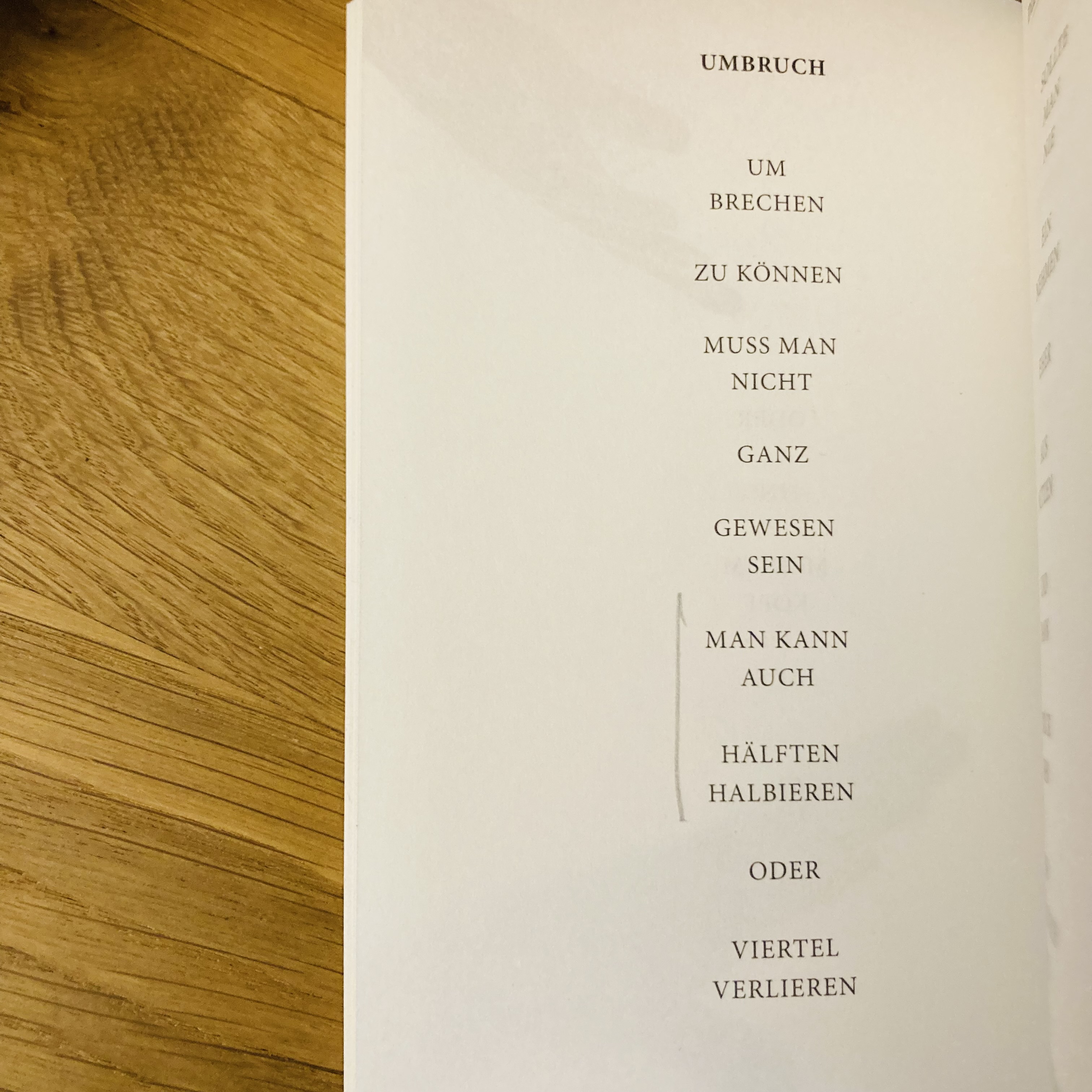 Die Gedichte lassen sich als Schichten einer Atmosphäre lesen, durch die das lyrische Ich fällt. Insgesamt werden drei (mehr oder weniger zum Scheitern verurteilte) Versuche unternommen, ein nicht näher benanntes Du abzuschreiben. Was bedeutet es, verliebt zu sein, sich auf ein Gegenüber, eine Beziehung einzulassen? „UNENDLICH VIEL SORTIEREN“, so die Antwort in einem der Texte. Mit dem Sortieren gehen oft auch das Rechnen und Berechnen einher. Die traurige Wahrheit: „MAN MANN AUCH / HÄLFTEN HALBIEREN.“ Und was dabei in Liebesdingen rauskommt, ist – gegen alle mathematische Logik – oft weniger als ein Viertel.