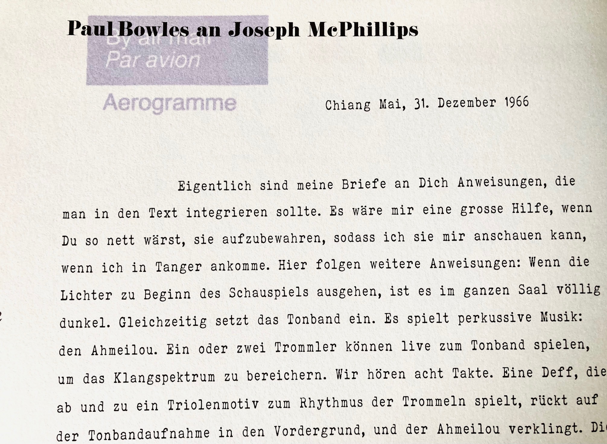 Man kann sagen, dass das Stück in den Briefen entstand, die sich Bowles und McPhillips in einem Zeitraum von ein paar Monaten schrieben. Über Ozeane hinweg, in andere Länder. Und aufregend ist es, den Wegen dieser Briefe und dem Arbeitsprozess beider Künstler in ihnen zu folgen. Auch einer Freundschaft, die in den Zeilen schwingt.