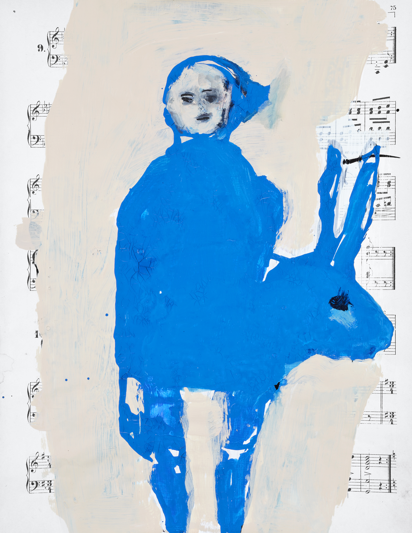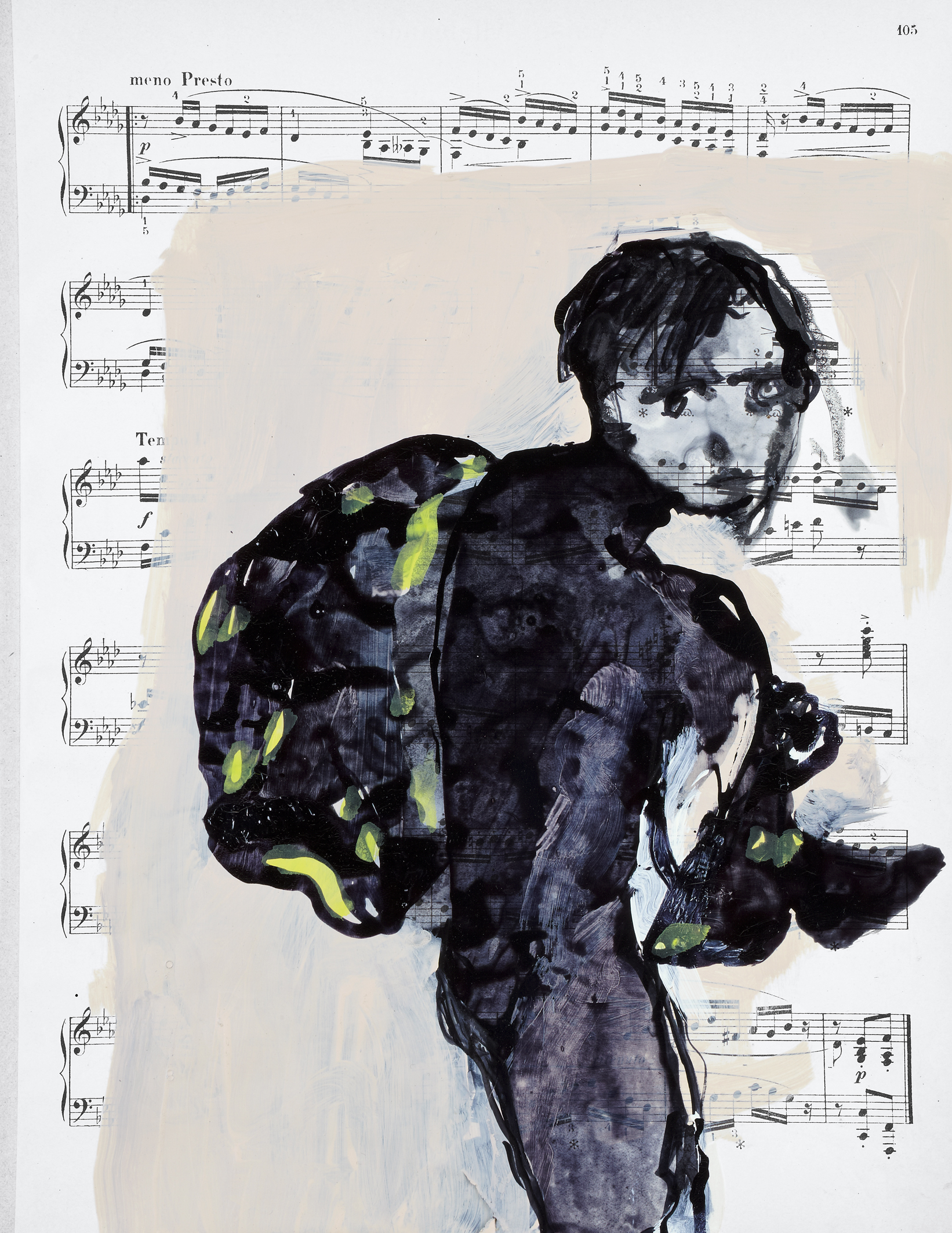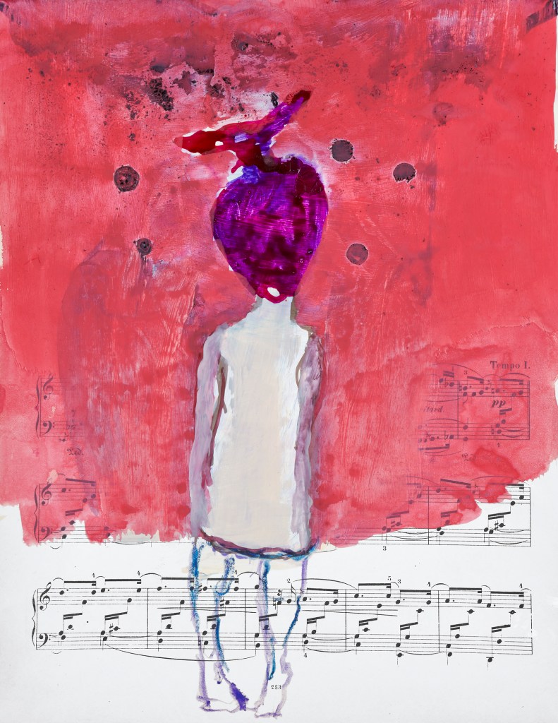 Die junge Frau auf der Doppelseite 14. Links steht oben auf der Partitur „Promenade“, und rechts trägt die junge Frau ihre Sprachlosigkeit/Atemlosigkeit durch ihr Leben. Dafür steht der Fisch. Er sieht aus wie ein Monster, hat das Maul aufgerissen, denn ein Fisch ist auf dem Trockenen nicht lebensfähig und schnappt nach Luft. Das Bild ist ein Symbol für „Sprachlosigkeit“. Und Sprachlosigkeit bedeutet Isolation. Ferne. Fehlende Identität. Ich erkenne darin die Schwierigkeiten junger Frauen (meiner Generation?) sich selbst zu finden. Erziehung und traditionelle Rollenzuschreibungen machten es Frauen ja sehr lange sehr schwer, einen selbst gewählten Weg (als Künstlerin) einzuschlagen. Von Gleichberechtigung waren/sind wir (in der Kunst) und in großen Teilen der Welt immer noch ziemlich weit entfernt.